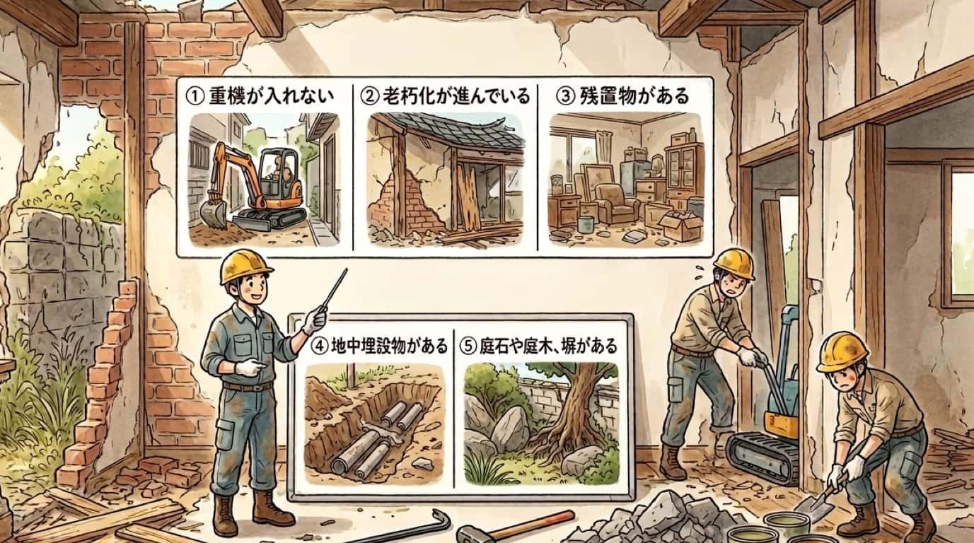 大型重機が使えず、小型重機の使用や手こわしでの工程が増えると、工期も延びやすいので注意が必要です。
